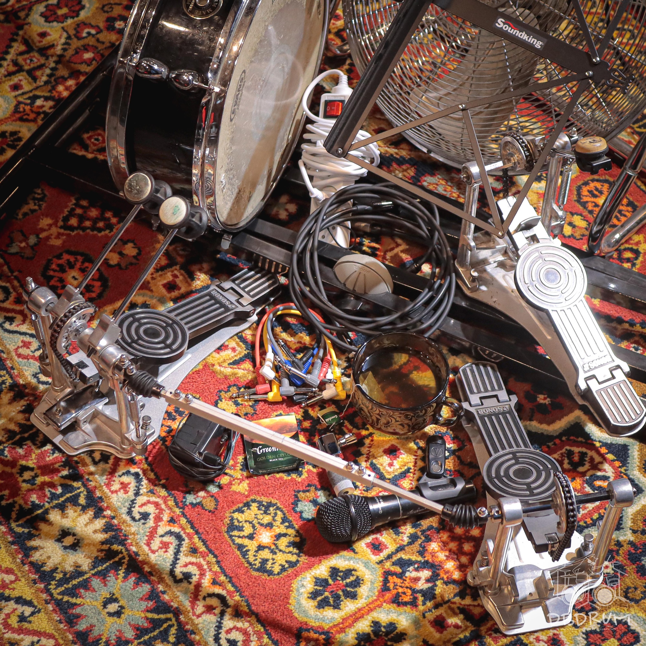Педаль, кардан, малый барабан, замок на хэт. Стойки для клавишных, пюпитр, микрофон. Коммутация для гитар, патчи и блок питания для педалей. Тройник, чай, кофе, вентилятор.
